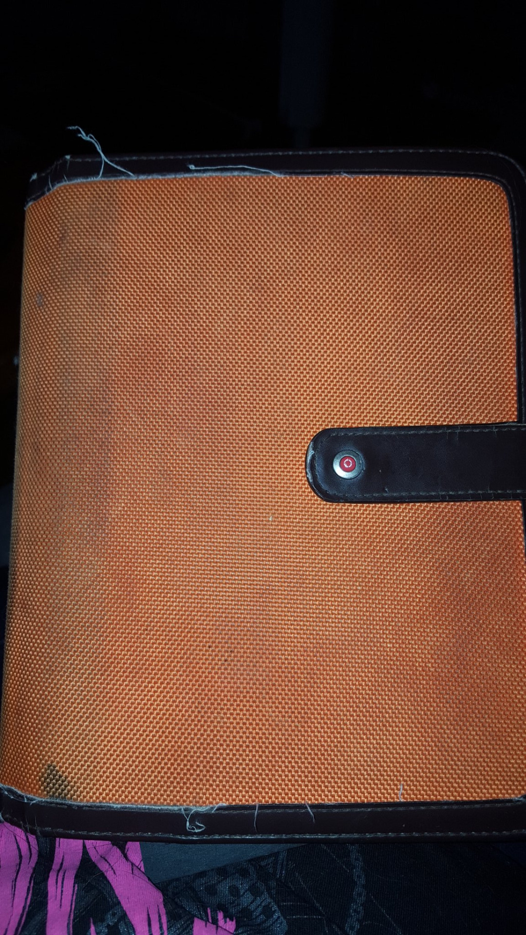 This is my poor, battered planner cover. It’s from Franklin-Covey, purchased around 2000/2001, Classic size, orange nylon. It has been through hell and back, and as you can see, it looks a little less presentable/professional with every passing year.