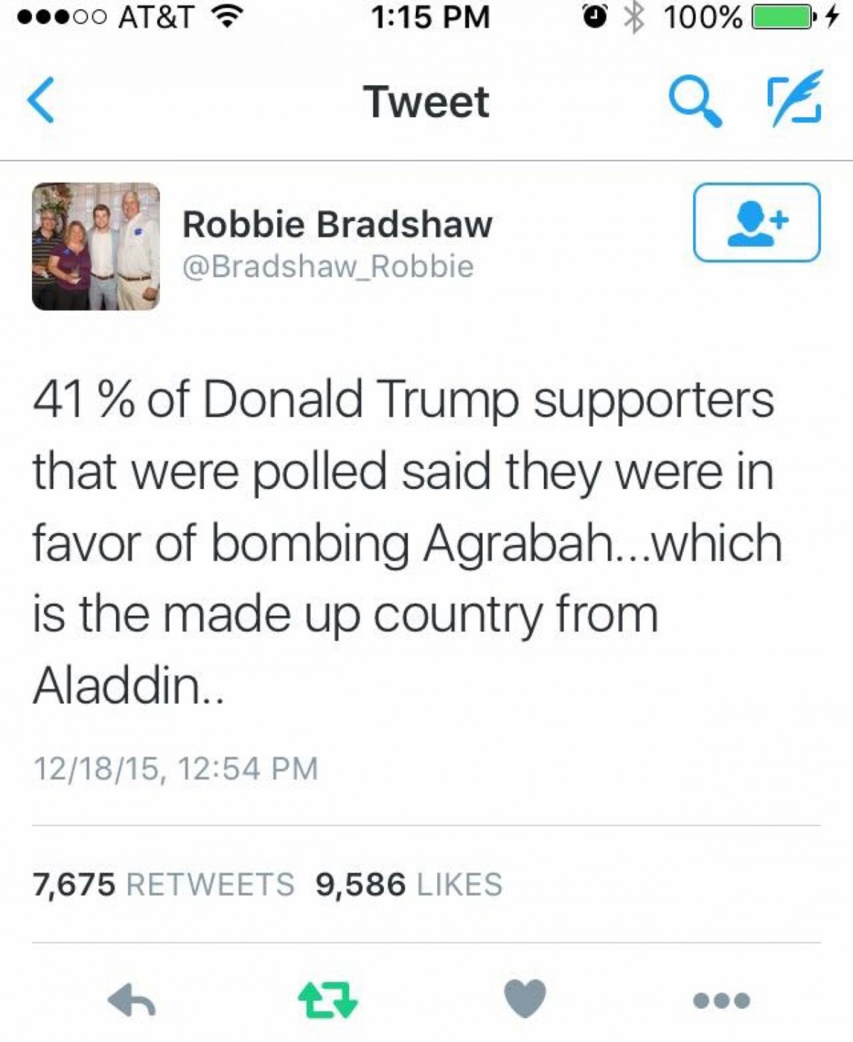 Also: “ We asked the same question of Democrats, and 36% of them opposed bombing Agrabah to 19% in support.”