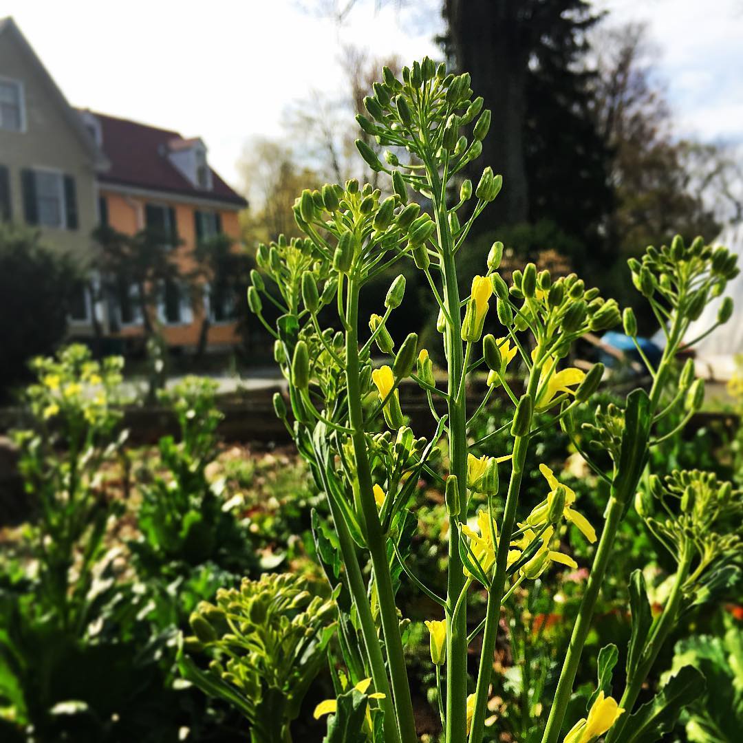 Yesterday this flowering was stressful, today it is a relief! Why? We over-wintered three varieties of Brassica oleracea (a species that includes cabbage, kale, collards, broccoli, brussels sprouts, cauliflower, etc) at Roughwood, with intentions to move two of them before they flowered, because they need about a half-mile between them to avoid unwanted cross-pollination. But spring fever is coming on early this year! So yesterday we brought our Caulet de Flandre plants (for those of you with @seedkeeping calendars, see tomorrow) to our friend Josh’s garden at the Garrett Williamson Foundation just days before their flowers are to open. And on Wednesday next week we will bring our Turnip-Rooted Cabbages to #kutztownseedfarm proabably just days before THEY will open. These Green Glaze Collards are amazing and delicious and RARE and I’m relieved that they are going to flower amongst themselves. I’m sure they’d be interesting with bulging purple stems or tall with purple leaves, but that’s not what we are going for: we are preserving our separate rare historically-important varieties. #greenglazecollards #cauletdeflandre #turniprootedcabbage #brassicaoleracea #brassica #seedsaving #seedkeeping #cruciferous #isolationdistance #roughwoodseedcollection