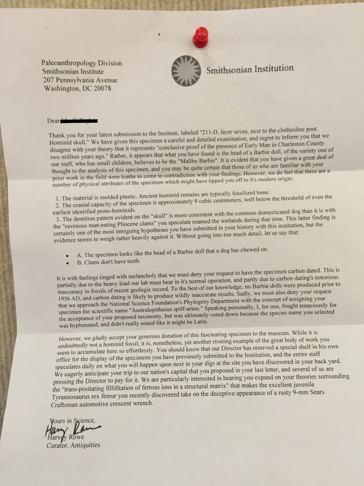 “Thank you for your latest submission to the Institute, labeled “211-D, layer seven, next to the clothesline post. Hominid skull.” We have gien this specimen a careful and detailed examination and regret to inform you that we disagree with you theory that it represents ‘conclusive proof of the presence of Early Man in Charleston County two million years ago.’ Rather, it appears that what you have found is the head of a Barbie doll, of the variety one of our staff, who has small children, believes to be the ‘Malibu Barbie’. It is evident that you have given a great deal of thought to the analysis of this specimen, and you may be quite certain that those of us who are familiar with your prior work in the field were loathe to come to contradiction with your findings. However, we do feel that there are a number of physical attributes of the specimen which might have tipped you off to it’s modern origin:
