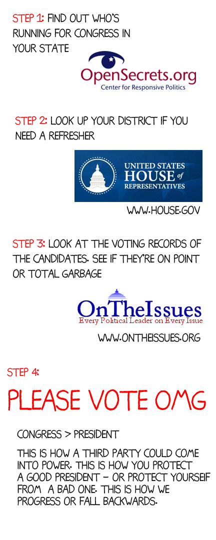AND DO NOT FORGET, MINDS CAN CHANGE OVER TIME. If every vote for the last 15 years was progressive, but in 1994 you find out that your candidate voted against a minimum-wage increase, consider all the evidence. Don’t throw the baby out with the bathwater. Have they voted for increases since then? Spoken about income inequality? Politicians are also people (well–most of them, I still think Malevolent Tangerine is a scientific experiment gone horribly wronger), and they can learn and grow too.