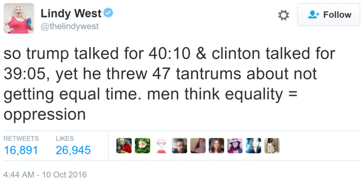 How do you give men the impression of a female majority? Show them a female minority, and let that minority do some talking. This is how 15 minutes of Fey and Poehler becomes three hours of non-stop “estrogen,” how a Congress that’s less than 19 percent female becomes a “feminized” and male-intolerant political environment, and how one viable female Presidential candidate becomes an unstoppable, man-squashing Godzilla. Men tend to perceive equality when women are vastly outnumbered and underrepresented; it follows that, as we approach actual parity, men (and Elisabeth Hasselbeck, for some reason) will increasingly believe that we are entering an era of female domination.